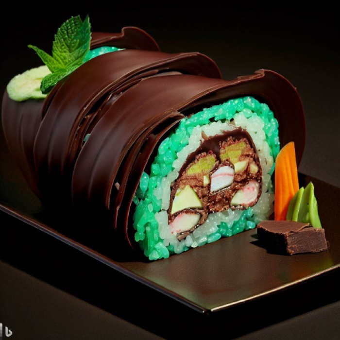 Experience a fusion delight: the Mint Chocolate Roll, inspired by Korean Kimbap. Wrapped in rich dark chocolate, it showcases savory pork belly, carrot, and cucumber. The surprise lies in the core – luscious Mint-flavored rice, adding a refreshing burst. Visually striking, this creative blend captivates with its unique twist, high quality, realistic